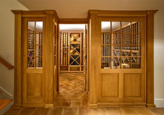 This stunning wine cellar with custom built case storage is flanked by a grand entrance of panels and windows.