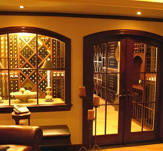 This stunning wine cellar with custom built case storage is flanked by a grand entrance of panels and windows.